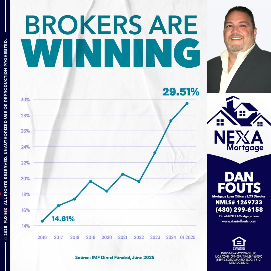 BROKERS ARE WINNING - Dan Fouts -Mortgage Loan OfficerHi, my name is Dan Fouts. I’m a Loan Officer with NEXA Mortgage LLC., offering personalized mortgage solutions, fast customized quotes, great rates and service with integrity.