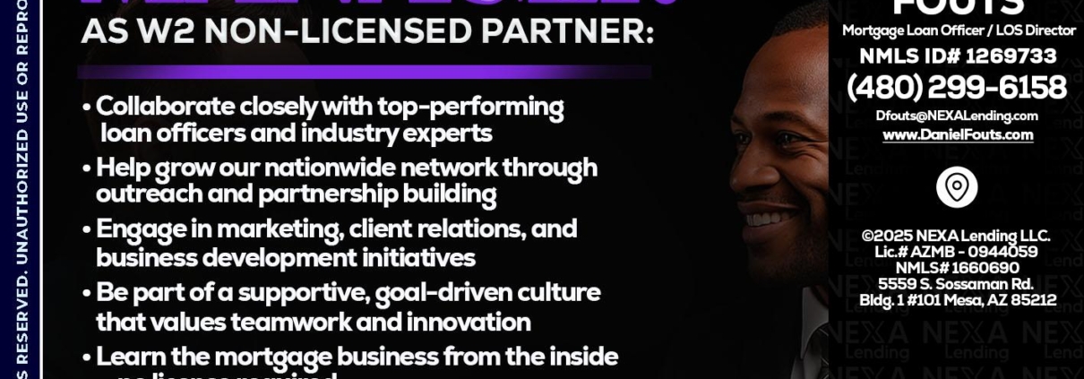 Hi, my name is Dan Fouts. I’m a Loan Officer with NEXA Mortgage LLC., offering personalized mortgage solutions, fast customized quotes, great rates and service with integrity.